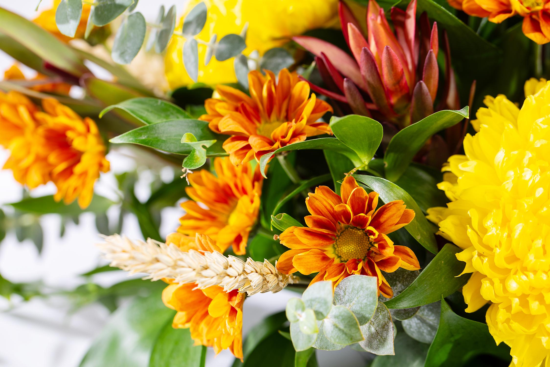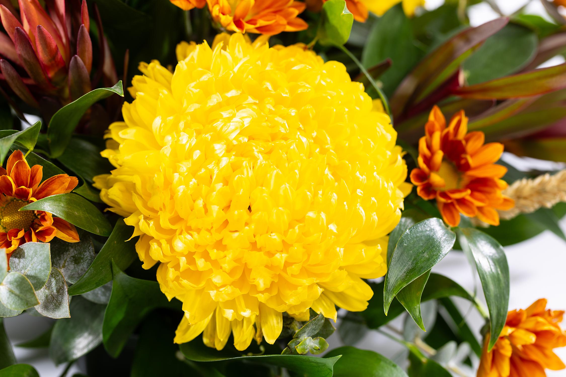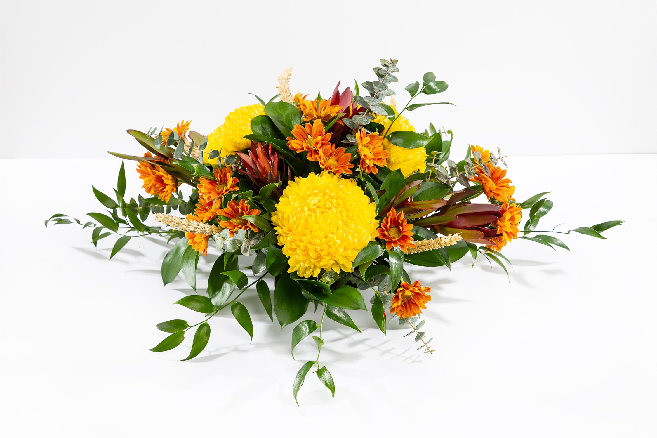 A centerpiece made with seasonal flowers and colors sure to delight your holiday table.