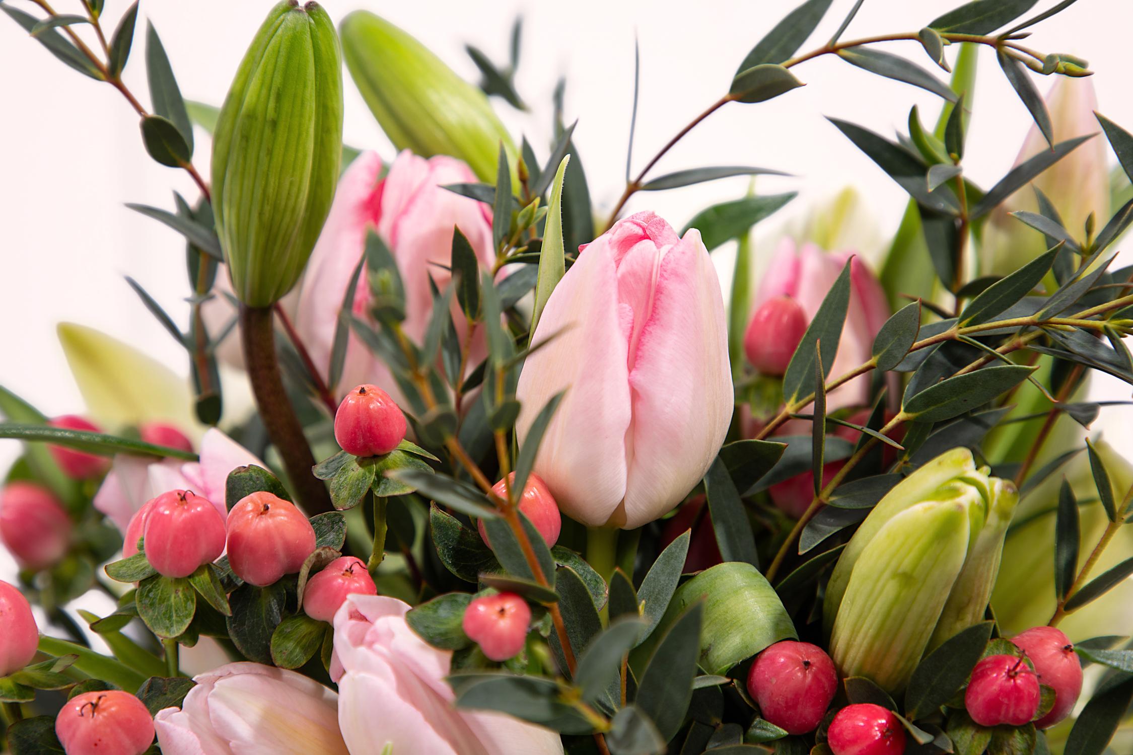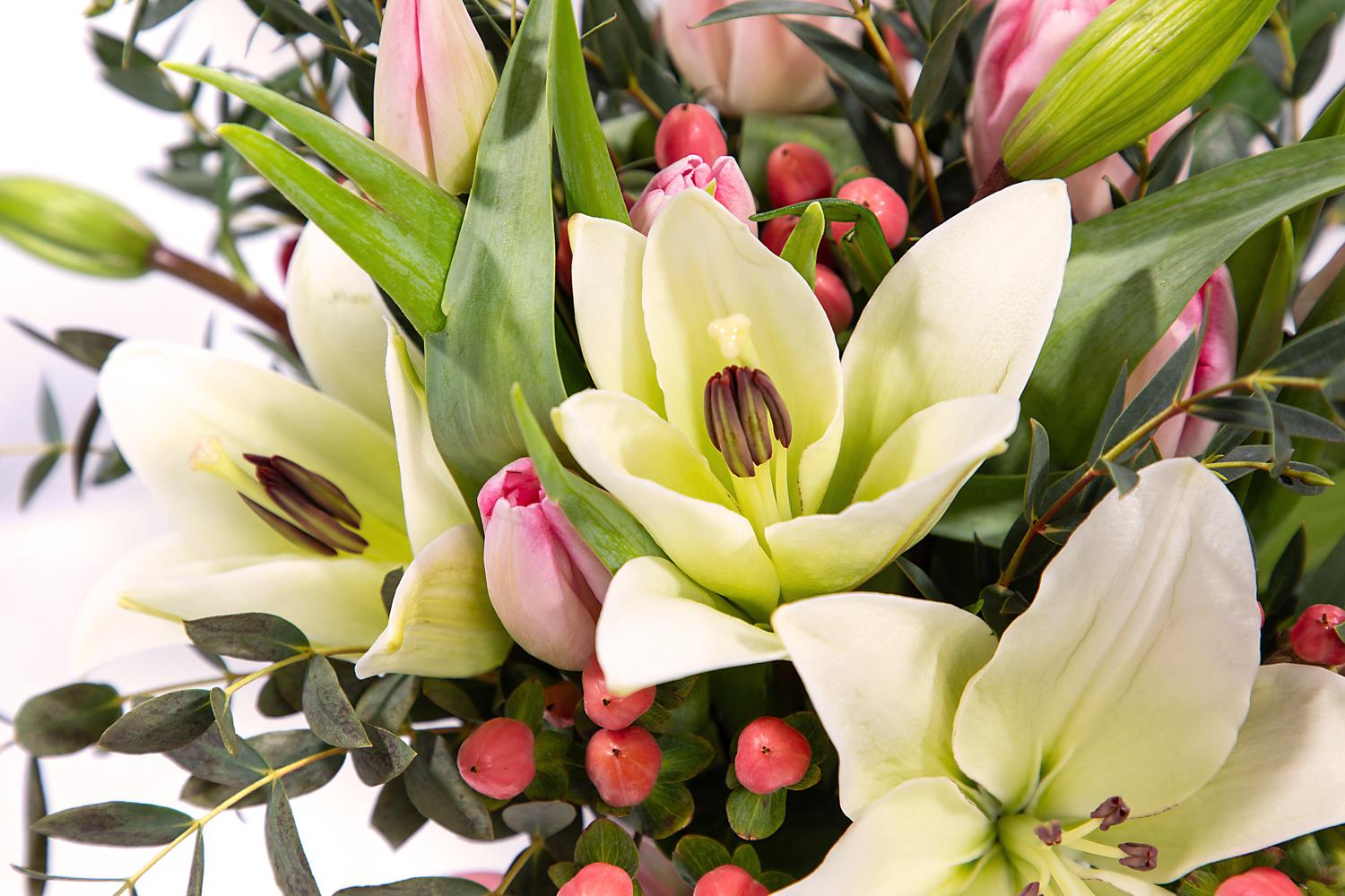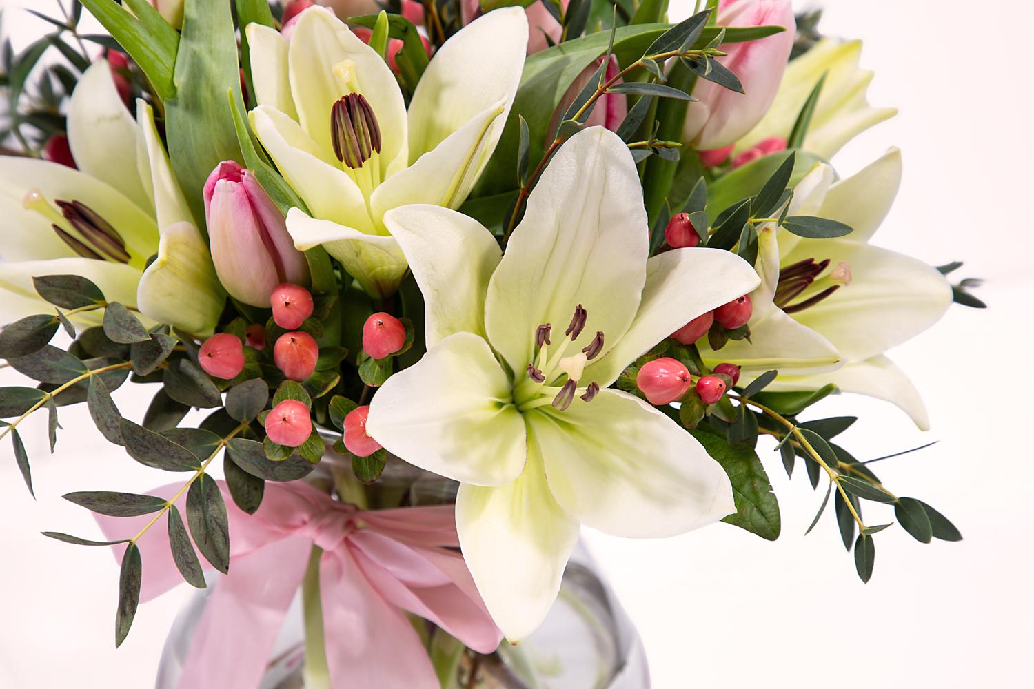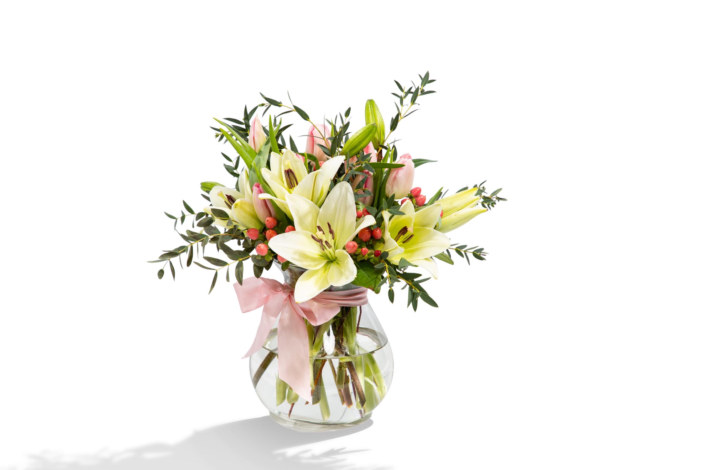 This beautiful arrangement is Styled Right Here using fragrant lilies, pastel colored tulips, and an assortment of complimentary greenery.