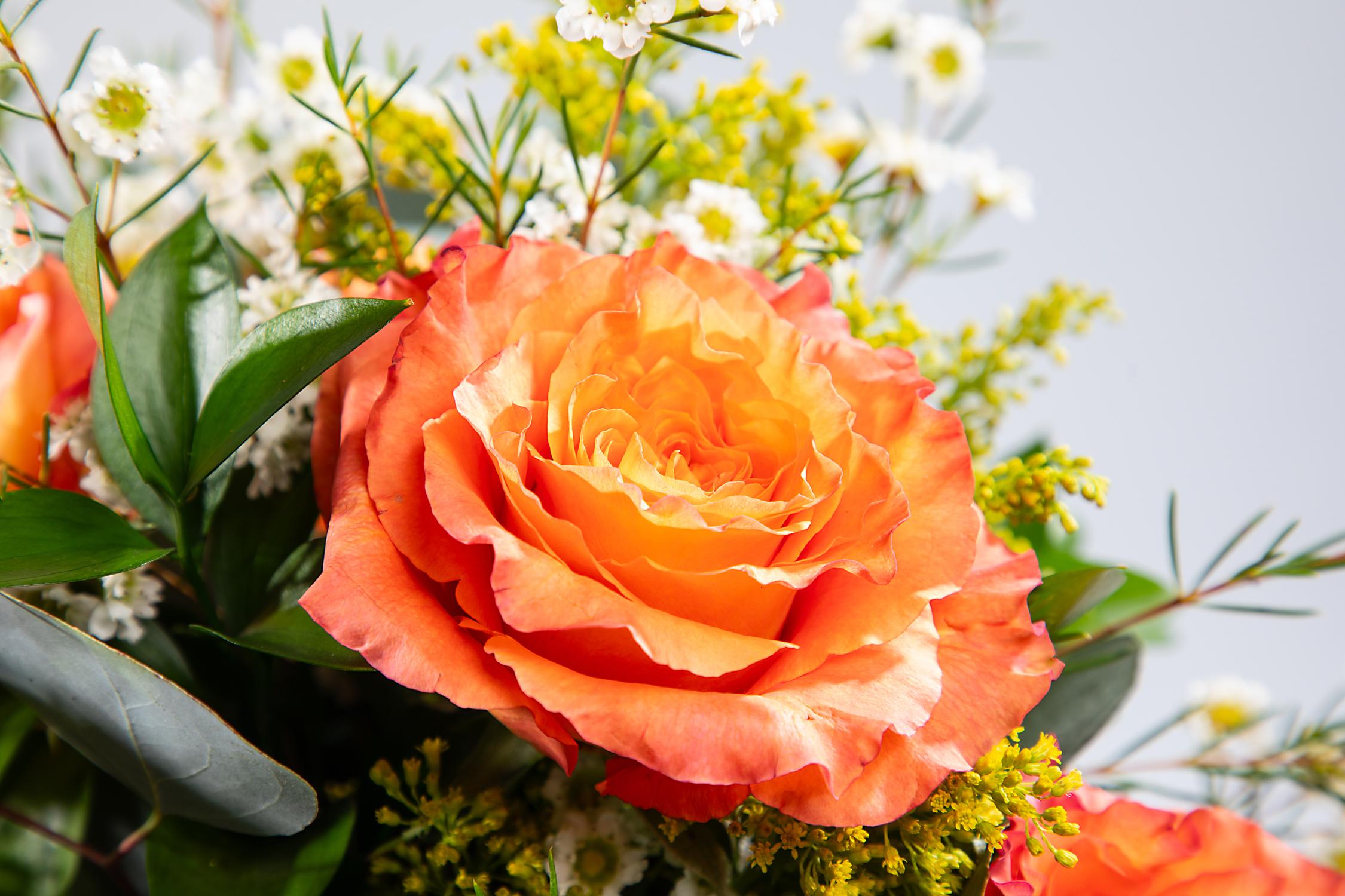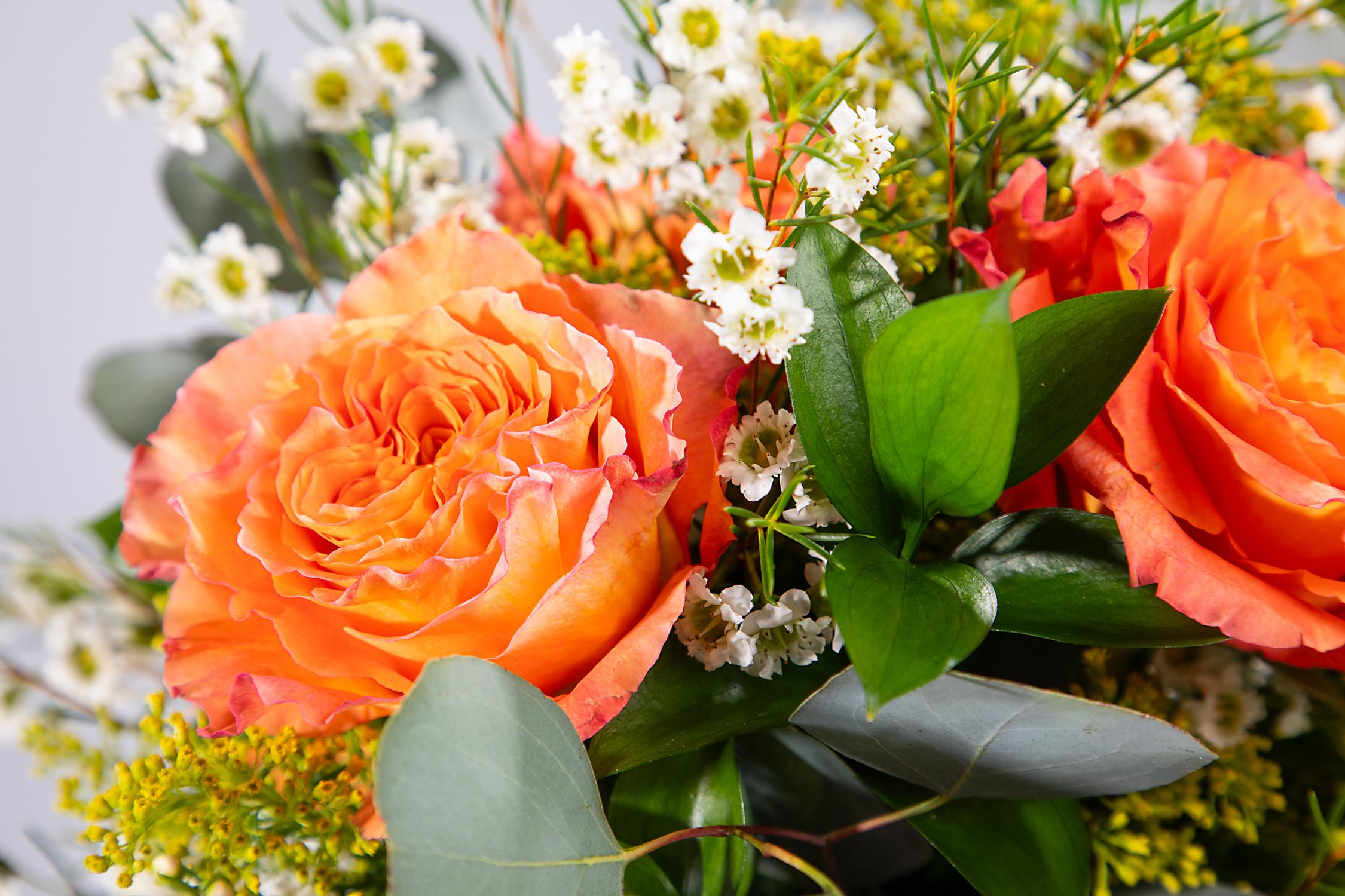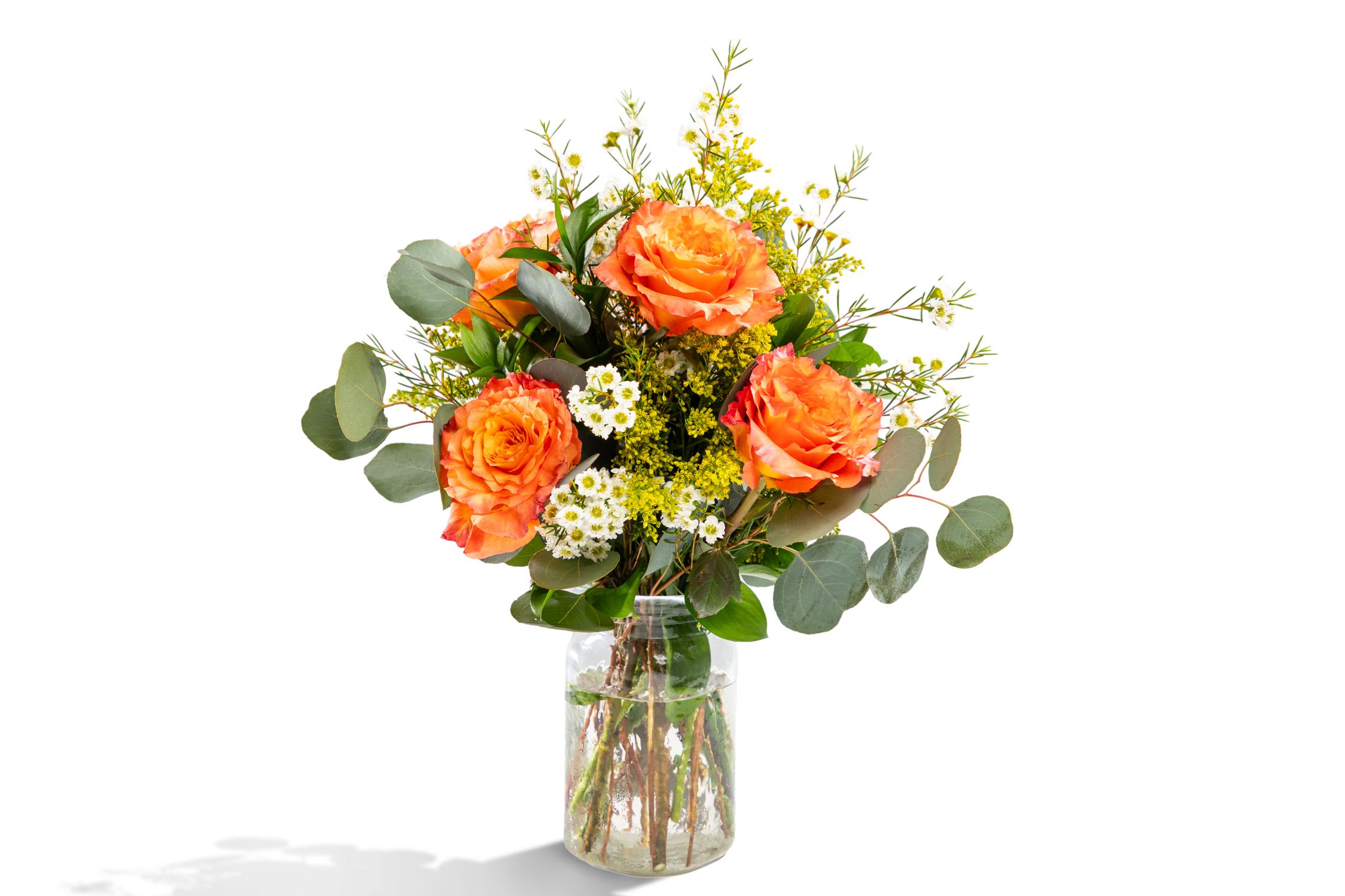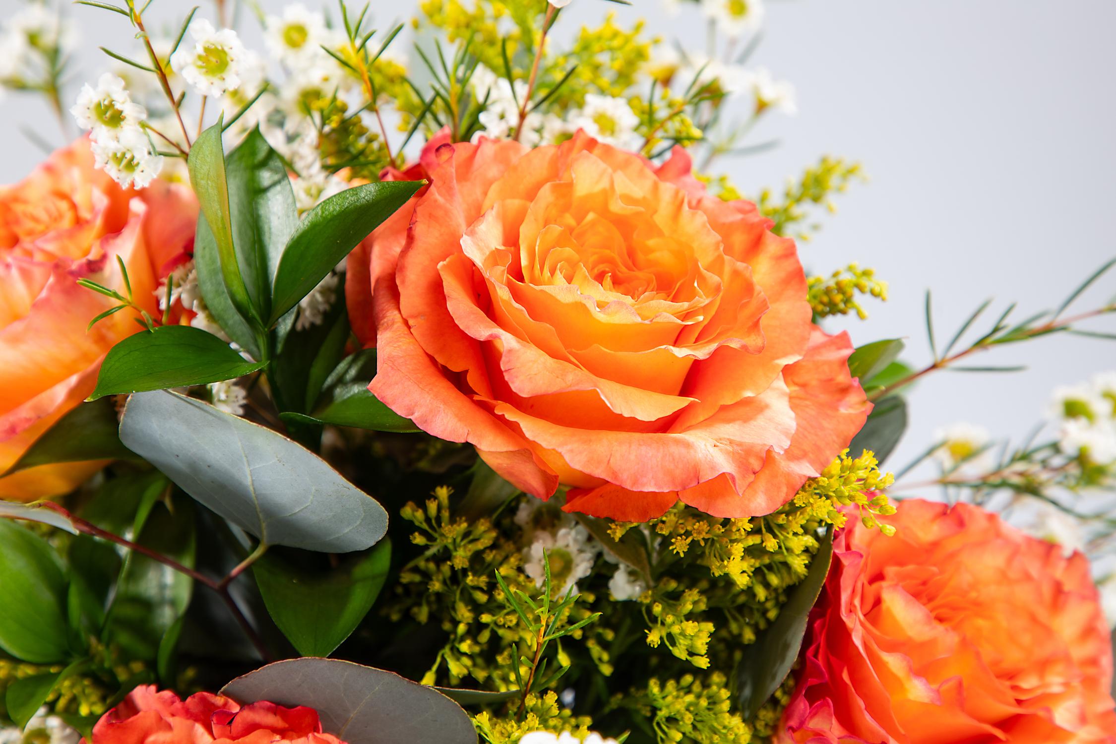 Spring is in full bloom with this brilliant bouquet brimming with half a dozen premium roses that are arranged with an assortment of accompanying flowers and mixed foliage and nestled in a rustic hammered glass vase. Your recipient is sure to adore this cheerful blend that celebrates the beauty of the season!